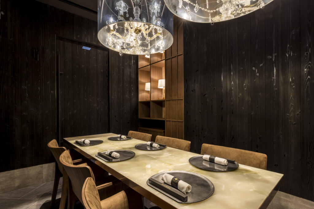 通常のダイニングエリアの他に桧板のカウンター席と快適な個室があり、現代日本美術の展示とともに楽しめる空間があります。
